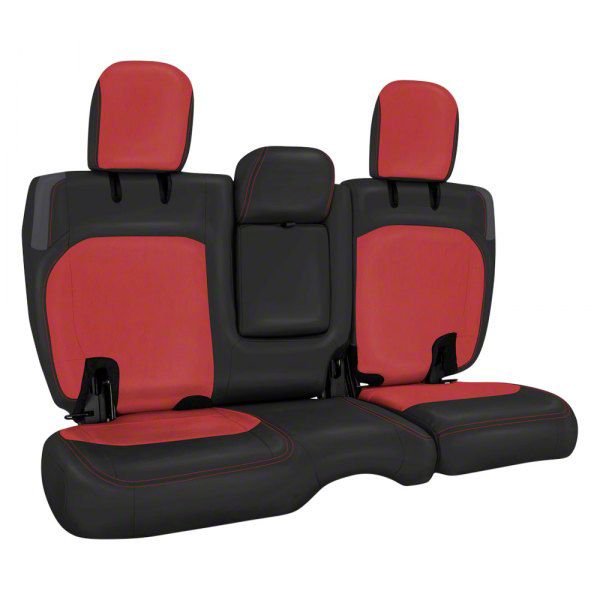 Modern Seat Styling. Add a stronger look and feel for your seats with this PRP Rear Bench Seat Cover; Black and Red on your Jeep Wrangler. Made to redesign, freshen, and protect your OEM bench, this Cover is precision designed to tightly hug your seat assembly and offer reliable stain-proofing as well as exceptional style.