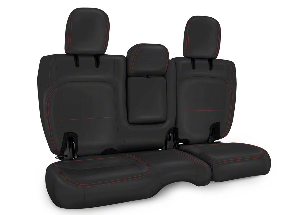 Application. The PRP Rear Bench Seat Cover; Black with Red Stitching fits 2018-2026 Jeep Wrangler JL 4-Door with Leather Interior Models.