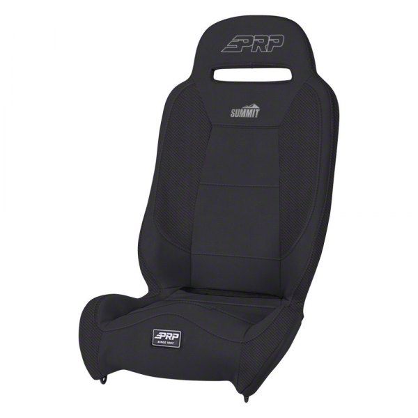 Description. If you need a little more hold than PRP’s Daily Driver but still want something easy to get in and out of, The Summit Suspension Seat is the perfect choice. The Summit features small bolsters near the thighs but increased hold at the kidneys. The center bolster in the bottom cushion helps to cradle your legs and give you more hold when getting sideways on the trails. The vinyl-coated nylon suspension liner and dual-density foam decrease the impact on the body, reducing the fatigue you feel after a long day in the dirt or dunes. Includes our standard mesh drain that allows water, mud, and dirt to drain out the bottom, rather than pile up in the seat. The bottom tabs easily bolt to PRP’s series of mounts built for Jeep, Broncos, Ford Rangers, and more. This seat features a Vinyl Center, Back, and Band.
