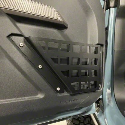 Construction and Appearance. Made from durable 0.10-gauge aluminum, these MOLLE panels feature a textured black finish for added corrosion resistance and a rugged aesthetic. Precision-built in Des Moines, Iowa, they are designed to withstand demanding environments while maintaining a clean, tactical appearance. Their form-fitting design integrates seamlessly with the Bronco’s factory door trim.