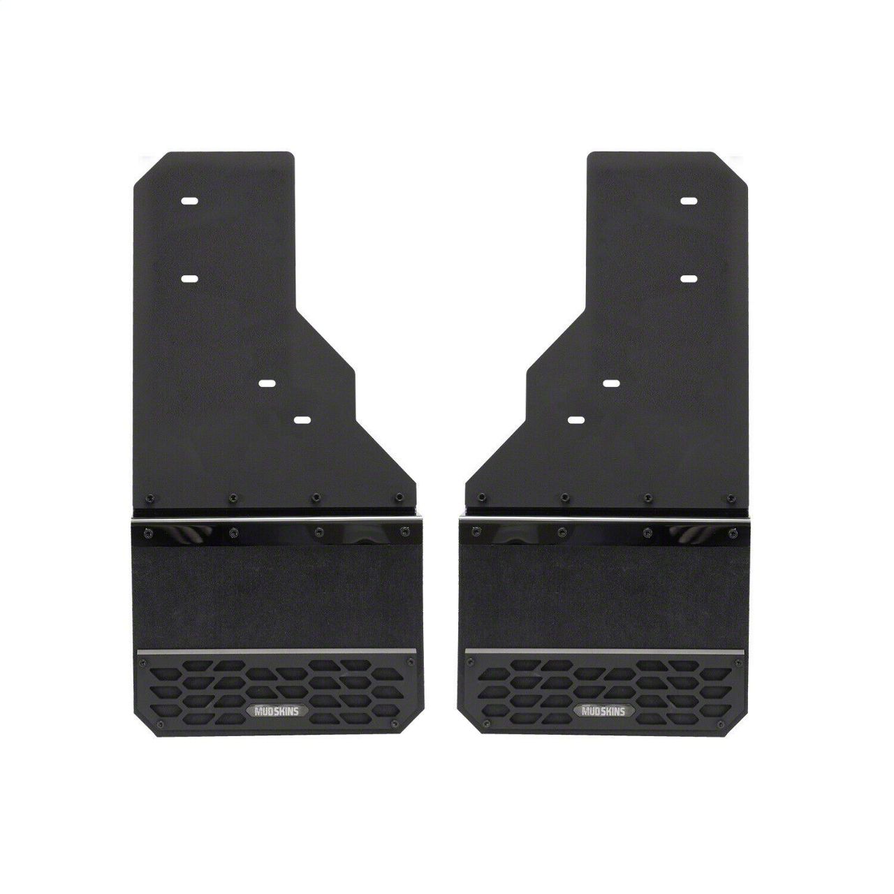 Construction and Appearance. Each Mud Skin is laser-cut for a precision fit and crafted with premium 18-gauge stainless steel and 0.25-inch thick rubber, ensuring durability and flexibility in all driving conditions. The High-Density Polyethylene finish and distinctive Hex Shield pattern lend a high-end, stylish look to your truck.