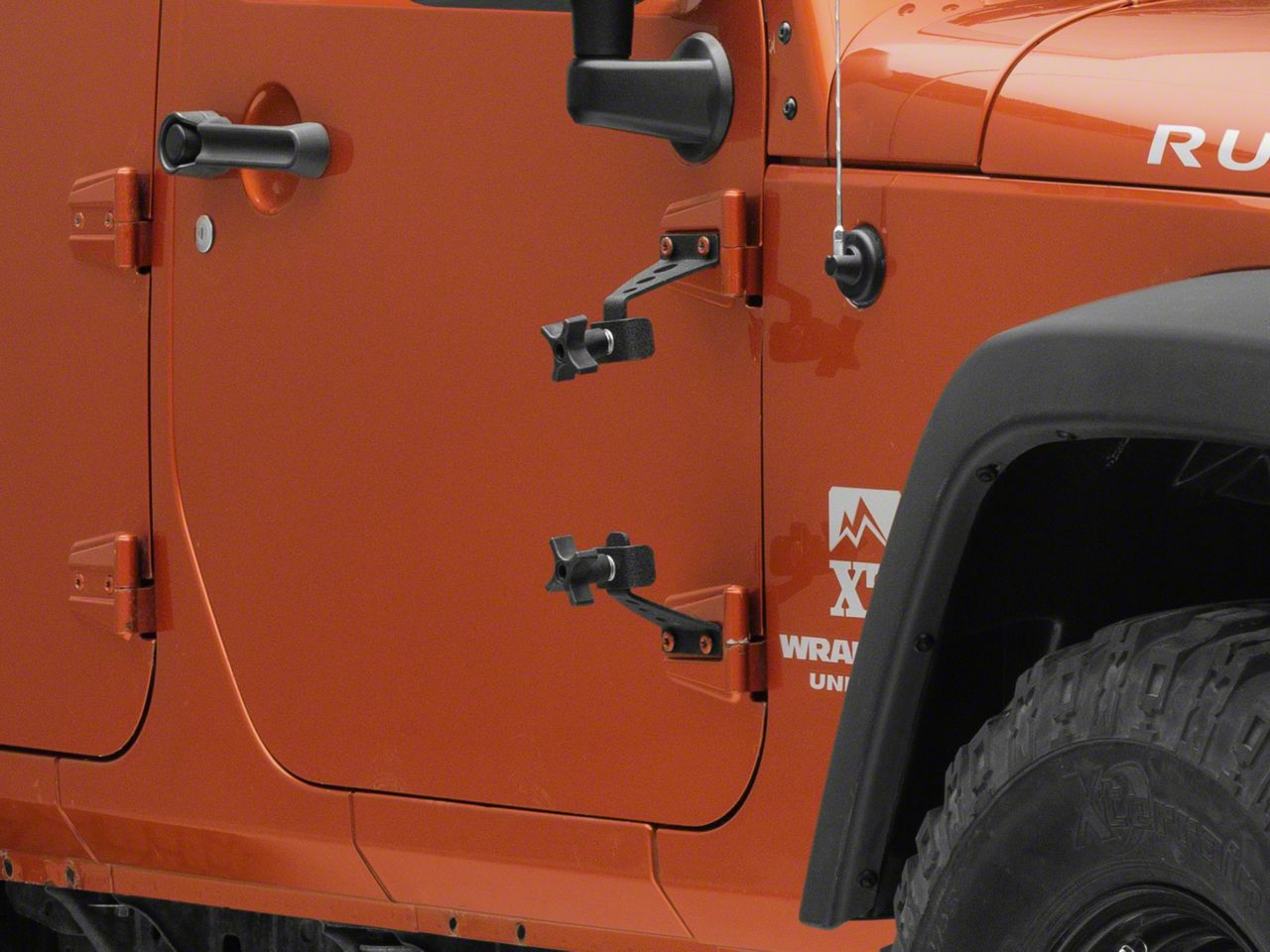 Stable and Easy Access Mount. Ensure the safety of your JK’s Hi-Lift Jack by installing this durable RedRock 4x4 Hi-Lift Jack Door Hinge Mounting Bracket Kit. These Mounting Brackets are designed to securely handle the weight and bulk of any Hi-Lift Jack. This Kit allows you to carry your hi-lift jack on the outside of your Jeep to save some cargo space and to facilitate easier access. These mounts attach to the factory door hinges to safeguard your high lift jack from being displaced, especially when driving on bumpy trails.
