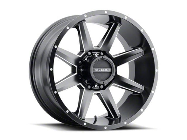 Raceline Stryker Satin Black Milled 6-Lug Wheel; 20x10; -19mm Offset. The Raceline Stryker Satin Black Milled 6-Lug Wheel offers a striking balance of style and refinement. Its unique design accentuates the vehicle's aesthetic, while the premium construction underscores its robust nature. This wheel is a perfect choice for those seeking both elegance and a strong visual statement.