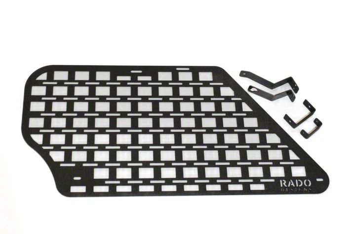 Driver Side MOLLE Storage Solution. The Rado Designs MOLLE Storage Panel offers a versatile and efficient way to organize and mount essential gear for off-road adventures. Designed specifically for the driver side, this panel allows for multiple mounting configurations, perfect for carrying recovery or trail equipment securely.