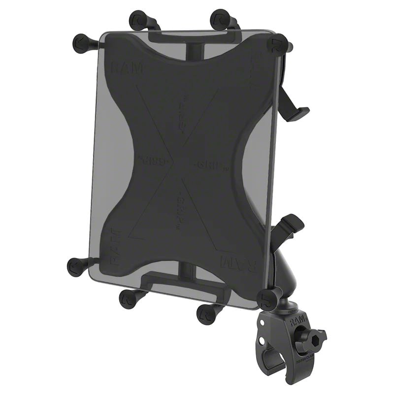 Description. The RAM-B-400-C-UN9-ROTO1U consists of the Tough-Claw™ rail clamp base, STANDARD length double socket arm and universal spring loaded X-Grip cradle for tablets. The spring loaded X-Grip cradle expands and contracts, allowing for a perfect custom fit of your tablet. Included are easy access grip knobs for quick insertion and release of your handheld device. The Tough-Claw™ rail clamp base is the perfect mounting base for quick and easy toolless installation and removal on round, square, odd shaped rails and bars. The Tough-Claw™ can be clamped on rails from 0.625" - 1.14" outer diameter. Perfectly suited for mounting on the yoke of an aircraft, the handlebars and seat posts of bicycles, kayak rails, roll bars and much more, the RAM Tough-Claw™ will soon become another essential RAM component in your collection of mounting options. The RAM-B-400-C-UN9-ROTO1U comes equipped with Roto-View technology that lets you rotate your tablet up to 90 degrees for easy viewing in either portrait or landscape mode. It is important to verify the dimensions of your handheld device with a case/sleeve/skin when determining the overall size.