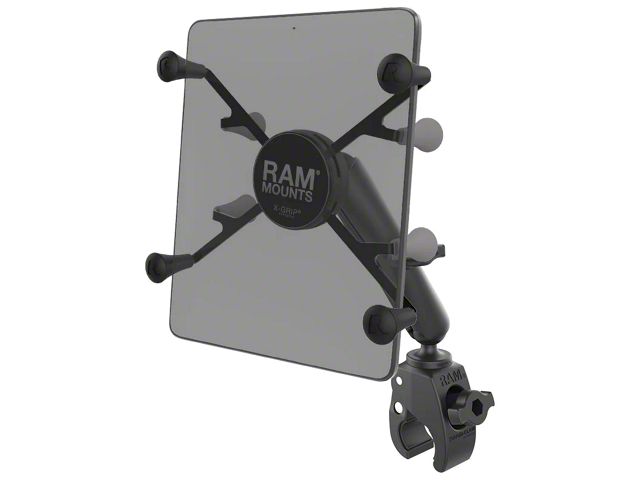 Description. The RAM-B-400-C-UN8U consists of the Tough-Clawâ„¢ rail clamp base, LONG length double socket arm and universal spring loaded X-Grip cradle for 7"-8" tablets. The spring loaded X-Grip cradle expands and contracts, allowing for a perfect custom fit of your tablet. Included are easy access grip knobs for quick insertion and release of your handheld device. The Tough-Clawâ„¢ rail clamp base is the perfect mounting base for quick and easy tool-less installation and removal on round, square, odd shaped rails and bars. The Tough-Clawâ„¢ can be clamped on rails from 0.625" - 1.14" outer diameter. Perfectly suited for mounting on the yoke of an aircraft, handlebars and seat posts of bicycles, kayak rails, roll bars and much more, the RAM Tough-Clawâ„¢ will soon become another essential RAM component in your collection of mounting options. The X-Grip includes a device tether recommended for outdoor applications. The cradle is compatible with handheld devices that will fit the dimensions listed below. It is important to verify the dimensions of your handheld device with a case/sleeve/skin when determining the overall size.
