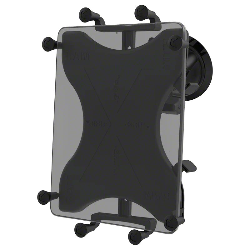 Description. The RAM-B-166-UN9U consists of a 3.3" diameter suction cup twist lock base, double socket arm, round base adapter and universal X-Grip clamping cradle for 10" tablets. The suction cup base is designed to have a strong hold on glass and non-porous plastic surfaces. The mount is designed with a RAM 1" diameter patented rubber ball and socket system that has adjustment points at both ends of the double socket arm; this allowing for almost infinite adjustment and perfect viewing angles. The X-Grip clamping cradle consists of a composite spring loaded cradle, expandable grip arms and additional bottom support keeper. Included are extra easy access grip knobs, located on the back of the cradle for quick release of your tablet. The X-Grip clamping cradle expands and contracts for perfect fit of most 10" tablets with or without sleeves, as well as some smaller tablets. Please verify dimensions of your tablet below for compatibility with the X-Grip. The X-Grip cradle is compatible with handheld devices that will fit the dimensions listed below. It is important to verify the dimensions of your handheld device with a case/sleeve/skin when determining the overall size.