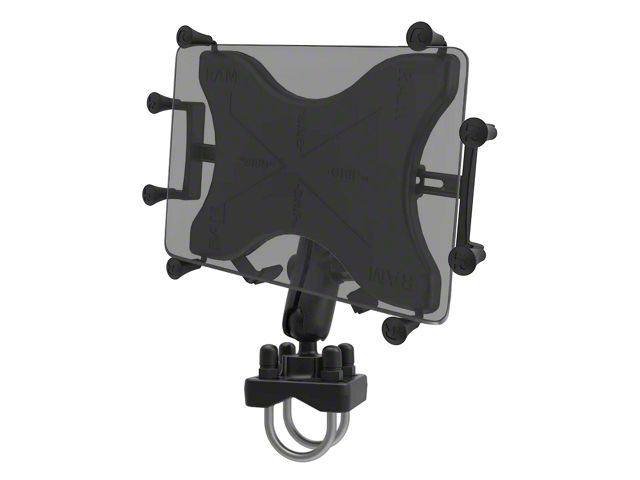 Description. The RAM-HOL-UN9-235U consists of a double stainless steel u-bolt base, double socket arm, round base adapter and universal X-Grip clamping cradle for 10" tablets. Included in this package is hardware that will accommodate rails from 1" to 1.25" in diameter. The base includes black cover caps to be placed over the exposed ends of the u-bolt. The mount is designed with a RAM 1.5" diameter patented rubber ball and socket system that has adjustment points at both ends of the double socket arm; this allowing for almost infinite adjustment and perfect viewing angles. The X-Grip clamping cradle consists of a composite spring loaded cradle, expandable grip arms and additional bottom support keeper. Included are extra easy access grip knobs, located on the back of the cradle for quick release of your tablet. The X-Grip clamping cradle expands and contracts for perfect fit of most 10" tablets with or without sleeves, as well as some smaller tablets. Please verify dimensions of your tablet below for compatibility with the X-Grip.
