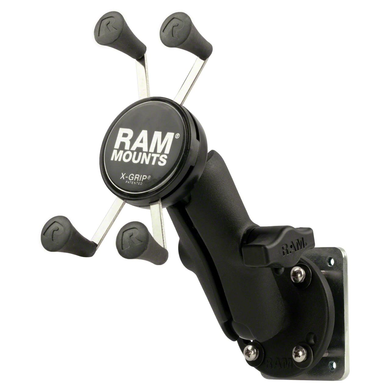 Description. The RAM-B-138-UN7-225BU consists of a 3” x 3” steel backer plate, 2.5" diameter round base, double socket arm and universal spring loaded X-Grip® cradle for cell phones. Designed into the mount is a 1" diameter patented rubber ball and socket system with adjustment points at the both ends of the socket arm; this with a twist of the arm knob, allows you can move the mount to your optimum viewing position. The included X-Grip® cradle has a clean and clever four leg design that sports great holding power without hiding your phone behind foam pads and plastic. The spring loaded X-Grip® cradle expands and contracts, allowing for a perfect custom fit of your cell phone. The perfect complement to the modern sleek interior of today's vehicles, the RAM X-Grip® is the cell phone cradle evolved.