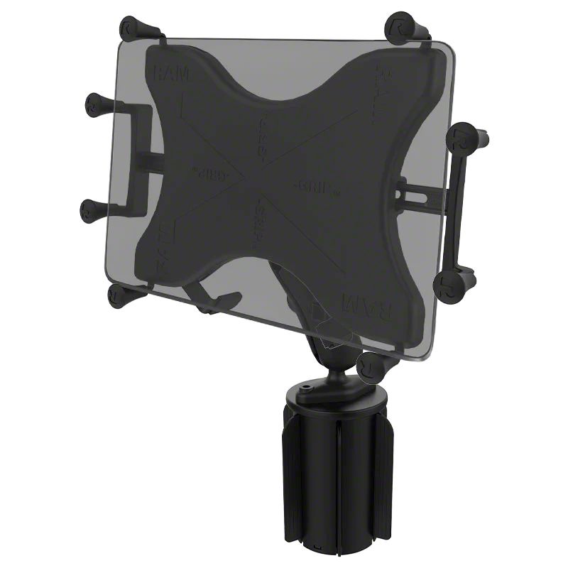 Description. The RAP-299-3-UN9U consists of the RAM-A-CANâ„¢ cup holder base, double socket arm and universal X-Grip cradle. Included are support fins that flex and can be trimmed, making the cup holder base conform to most vehicle cup holders. The mount is designed with a RAM 1" diameter patented rubber ball and socket system that has adjustment points at both ends of the double socket arm, allowing for almost infinite adjustment and perfect viewing angles. The X-Grip cradle is compatible with handheld devices that will fit the dimensions listed below. It is important to verify the dimensions of your handheld device with a case/sleeve/skin when determining the overall size.