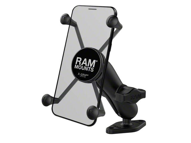 Description. The popular spring-loaded RAM X-Grip phone holder features an 'X' design that expands and contracts to provide a perfect fit for your device – even if it's in a case. This large version of the RAM X-Grip fits phones ranging from 1.75" to 4.5" in width and keeps your device completely functional and accessible. The included diamond ball base features the industry-standard AMPS hole pattern, while RAM ball and socket technology allows for near-infinite adjustability to achieve the ideal viewing angle – and helps to extend the life of your phone by providing shock and vibration damping. For outdoor applications – like being used as a motorcycle phone mount – the RAM X-Grip includes a device tether that is recommended for added security and peace of mind.