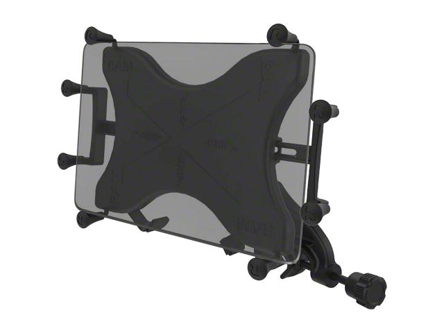 Description. The RAM-B-121-UN9U consists of a yoke clamp base, double socket arm, round adapter base and universal X-Grip III clamping cradle for 10" tablets. The RAM yoke clamp mount will fit rails from 0.625" to a maximum of 1.25". The 1" rubber ball is at a right angle to the plane of the mount; when connected to a rail, the ball sits parallel to the rail. The mount is designed with a RAM 1" diameter patented rubber ball and socket system that has adjustment points at both ends of the double socket arm; this allowing for almost infinite adjustment and perfect viewing angles. The X-Grip III clamping cradle consists of a composite spring loaded cradle, expandable grip arms and additional bottom support keeper. Included are extra easy access grip knobs, located on the back of the cradle for quick release of your tablet. The X-Grip III clamping cradle expands and contracts for perfect fit of most 10" tablets with or without sleeves, as well as some smaller tablets. Please verify dimensions of your tablet below for compatibility with the X-Grip III.