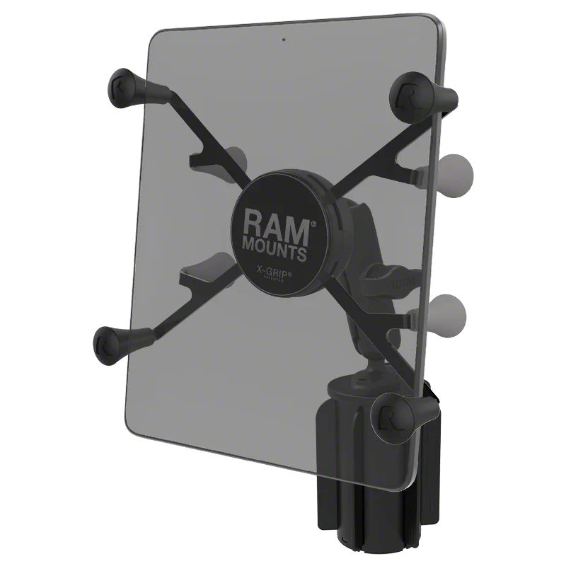 Description. The RAP-299-3-UN8U consists of the RAM-A-CAN™ cup holder base, double socket system and universal spring loaded X-Grip cradle for 7"-8" tablets. The cup holder base includes a 6" flex mounting feature. A durable composite shell construction and soft fins that can be trimmed to fit makes the cup holder mount one of the most portable and versatile “Go Anywhere” products offered. The mount is designed with a RAM 1" diameter patented rubber ball and socket system that has adjustment points at both ends of the double socket arm; this allowing for almost infinite adjustment and perfect viewing angles. The included X-Grip cradle has a clean and clever four leg design that sports great holding power without hiding your phone behind foam pads and plastic. The spring loaded X-Grip cradle expands and contracts, allowing for a perfect custom fit of your tablet. The perfect complement to the modern sleek interior of today's vehicles, the RAM X-Grip is the cell phone cradle evolved. The X-Grip includes a device tether recommended for outdoor applications. The cradle is compatible with handheld devices that will fit the dimensions listed below. It is important to verify the dimensions of your handheld device with a case/sleeve/skin when determining the overall size.