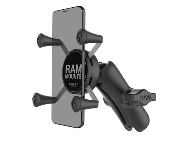 Description. The popular spring-loaded RAM X-Grip phone holder features an 'X' design that expands and contracts to provide a perfect fit for your device – even if it's in a case. Made of high-strength composite and stainless steel, the RAM X-Grip phone holder is compatible with a wide variety of RAM double socket arms and mounting bases. This version of the RAM X-Grip fits phones ranging from 1.87" to 3.25" in width and keeps your device completely functional and accessible, and this kit includes a medium length B size double socket arm. No matter what mounting base you pair the RAM X-Grip and double socket arm with, RAM ball and socket technology allows for near-infinite adjustability to achieve the ideal viewing angle – while also extending the life of your phone by providing shock and vibration damping. For outdoor applications – like being used as a motorcycle phone mount – the RAM X-Grip includes a device tether that is recommended for added security and peace of mind.