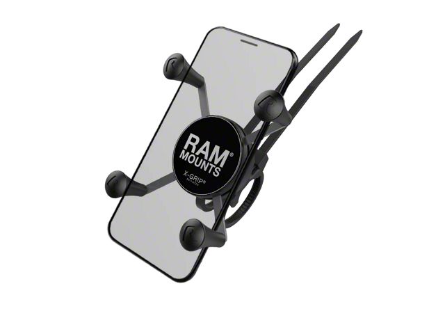 Description. The RAP-274-1-UN7U consits of RAM EZ-ON/OFF™ dual strap base and the popular spring-loaded RAM X-Grip phone holder, featuring an 'X' design that expands and contracts to provide a perfect fit for your device – even if it's in a case. Made of high-strength composite and stainless steel, the RAM X-Grip phone holder is compatible with a wide variety of RAM double socket arms and mounting bases. This version of the RAM X-Grip fits phones ranging from 1.87" to 3.25" in width and keeps your device completely functional and accessible. Adjust the zip ties for attachment to a variety of rails, from a minimum of .5" in diameter. For outdoor applications – like being used as a bicycle phone mount – the RAM X-Grip includes a device tether that is recommended for added security and peace of mind.