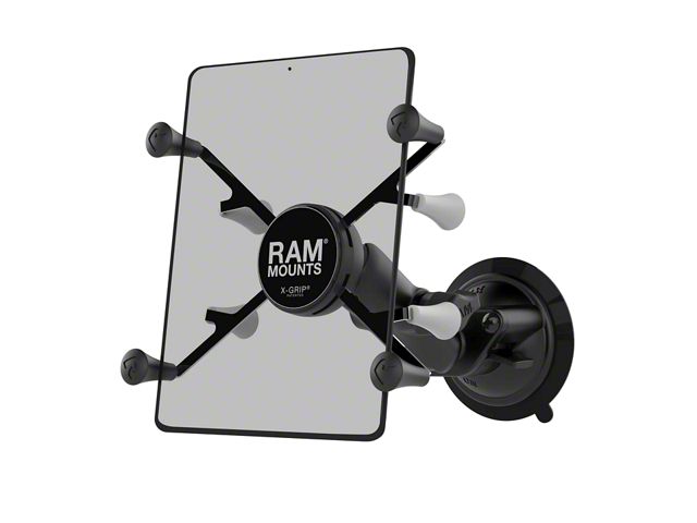 Description. The RAM-B-166-UN8U consists of a 3.3" diameter RAM Twist-Lock™ suction cup base, medium length double socket arm, and the popular spring-loaded RAM X-Grip 7"-8" tablet holder. The RAM X-Grip features an 'X' design that expands and contracts to provide a perfect fit for your device – even if it's in a case. Included are easy access grip knobs located on the back of the cradle for quick release of your tablet. No matter what double socket arm and mounting base you pair the RAM X-Grip with, RAM ball and socket technology allows for near-infinite adjustability to achieve the ideal viewing angle – while also extending the life of your phone by providing shock and vibration damping. The RAM X-Grip tablet holder includes a device tether recommended for added security and peace of mind. This version of the RAM X-Grip holder is compatible with tablets that will fit the dimensions listed below. It is important to verify the dimensions of device with its case, sleeve, or skin when determining the overall size.