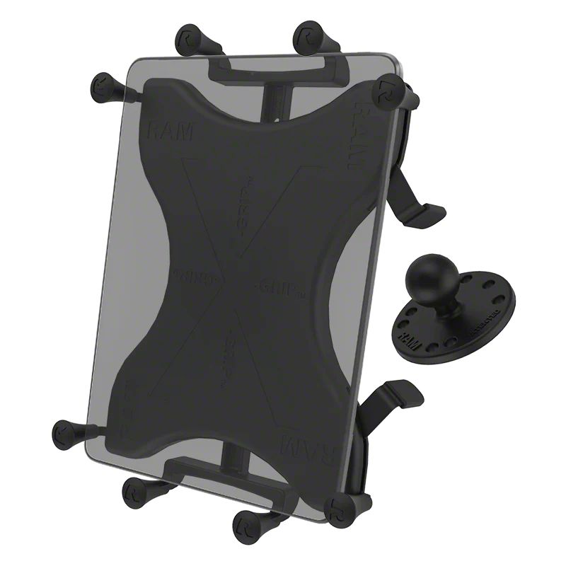 Description. The RAM-B-202-UN9U consists of a composite spring loaded cradle, expandable grip arms, additional bottom support keepers and 1" ball base adapter. Included are extra easy access grip knobs, located on the back of the cradle for quick release of your tablet. The RAM-B-202-UN9U expands and contracts for perfect fit of most 10" tablets with or without sleeves, as well as some smaller tablets. The included 1" ball base includes hardware to attach directly to the back of the cradle and is compatible with all "B" size double socket arms. Please verify dimensions of your tablet below for compatibility with the X-Grip. The X-Grip cradle is compatible with tablets devices that will fit the dimensions listed below. It is important to verify the dimensions of your tablet with a case/sleeve/skin when determining the overall size.