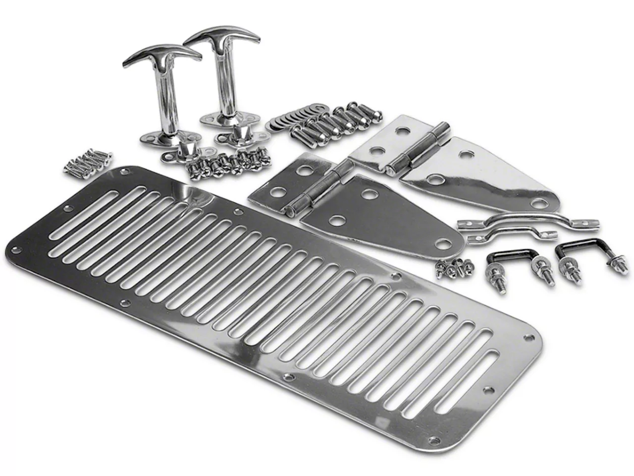 Complete Kit. Each part is designed as a direct fit for your factory equipment, ensuring a painless and easy upgrade. This kit includes a windshield tie down kit, a hood vent, footman loop, hood catches and hood hinges to give your entire hood a bright make over.