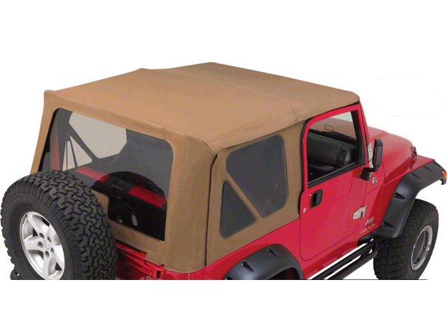 Quality Construction. This TJ Soft Top is crafted from durable 18 oz OEM grade vinyl material with a spice denim texture for a clean look. It includes clear heat sealed window panels to ensure a dry and weatherproof interior. These panels make use of marine grade zippers for easy and reliable removal during warmer months.