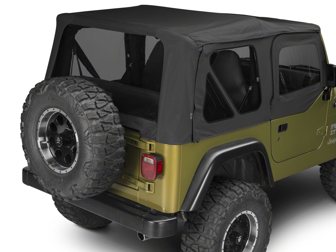 Look Better Than Ever. Your Wrangler can look even better than when you first got it! Replace your worn or damaged top and upper door skins with an improved 18-oz top made of a sturdy vinyl-coated polyester and cotton blend, with matching soft skins and clear windows. Both the material top and skins come in factory-matched black denim color, giving your Jeep a timeless look. The heavy-duty soft top outperforms the original with marine-grade zippers that resist degradation and yellowing, as well as enhanced wear resistance and reliable weatherproofing. Change up the look whenever you want by removing the rear windows entirely.