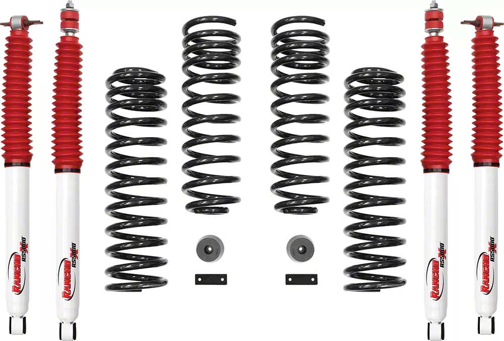 Improved Stance, Balance, and Handling. Reinforce your Jeep Wrangler’s on and off-road performance by using this Rancho 2-Inch Sport Suspension Lift Kit with RS5000X Shocks. This kit is intended to provide your JK with an aggressive stance, increased ground clearance, and superior off-road performance. It includes front and rear RS5000X Shocks, high-strength progressive rate coil springs, brake line brackets, and bump stops. These components offer bolder off-road confidence and improved driveability.