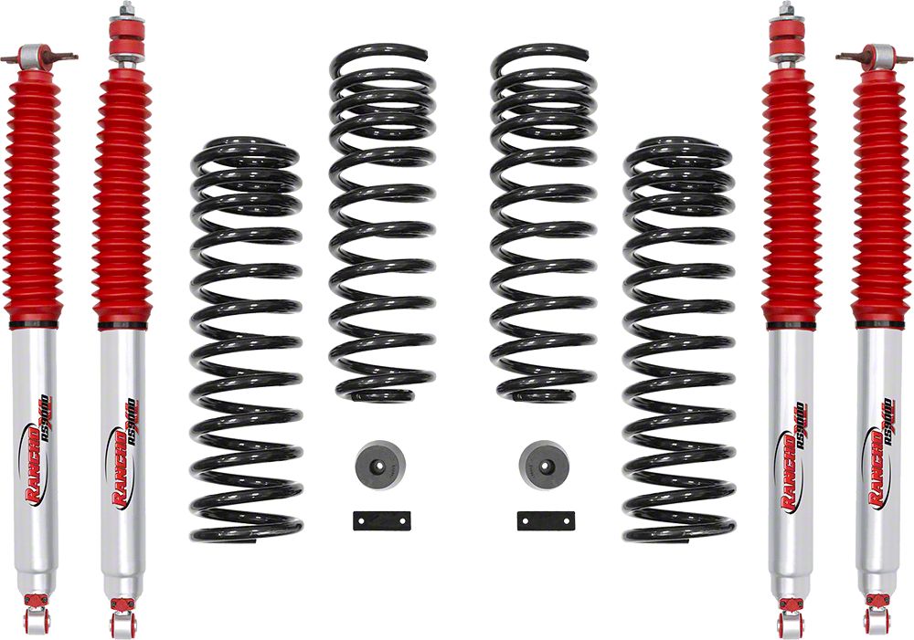 Bolder Off-Roading Capacity. Experience enhanced stance and reinforced off-road performance by installing this Rancho 2-Inch Sport Suspension Lift Kit with RS9000XL Shocks on your Jeep Wrangler. This suspension lift system is intended to provide you with excellent handling and stability. It comes with RS9000XL shock absorbers, progressive rate coil springs, bump stops, and brake line brackets — all designed to help you navigate the challenging trails with confidence and control.
