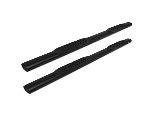 Construction and Appearance. These running boards feature a 5-inch oval-style stepping area with a textured black powder coat finish that adds aggressive flair and corrosion resistance. Angled end caps give them a finished OEM-inspired look, while the slide track mounting system provides adjustability and a clean fit. The durable construction ensures long-term performance in any driving condition—from urban streets to muddy trails.