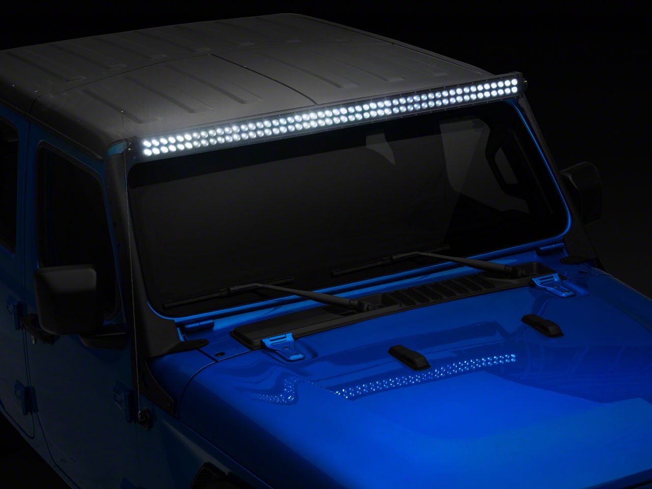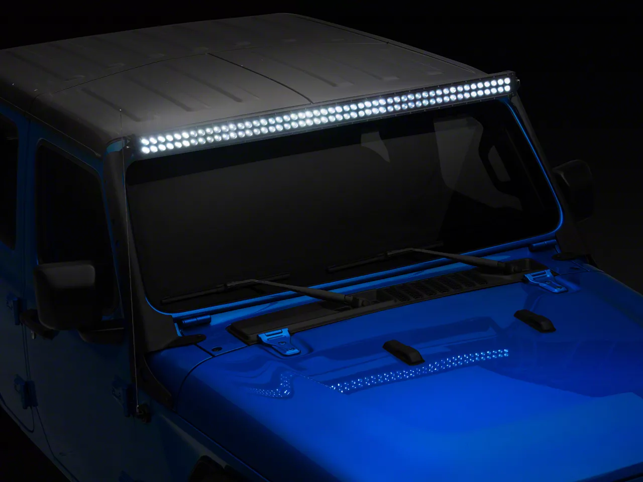 Application. This Raxiom 52-Inch Dual Row LED Light Bar with Windshield Mounting Brackets is designed to fit 2020-2026 Jeep Wrangler JT, excluding Mojave models.