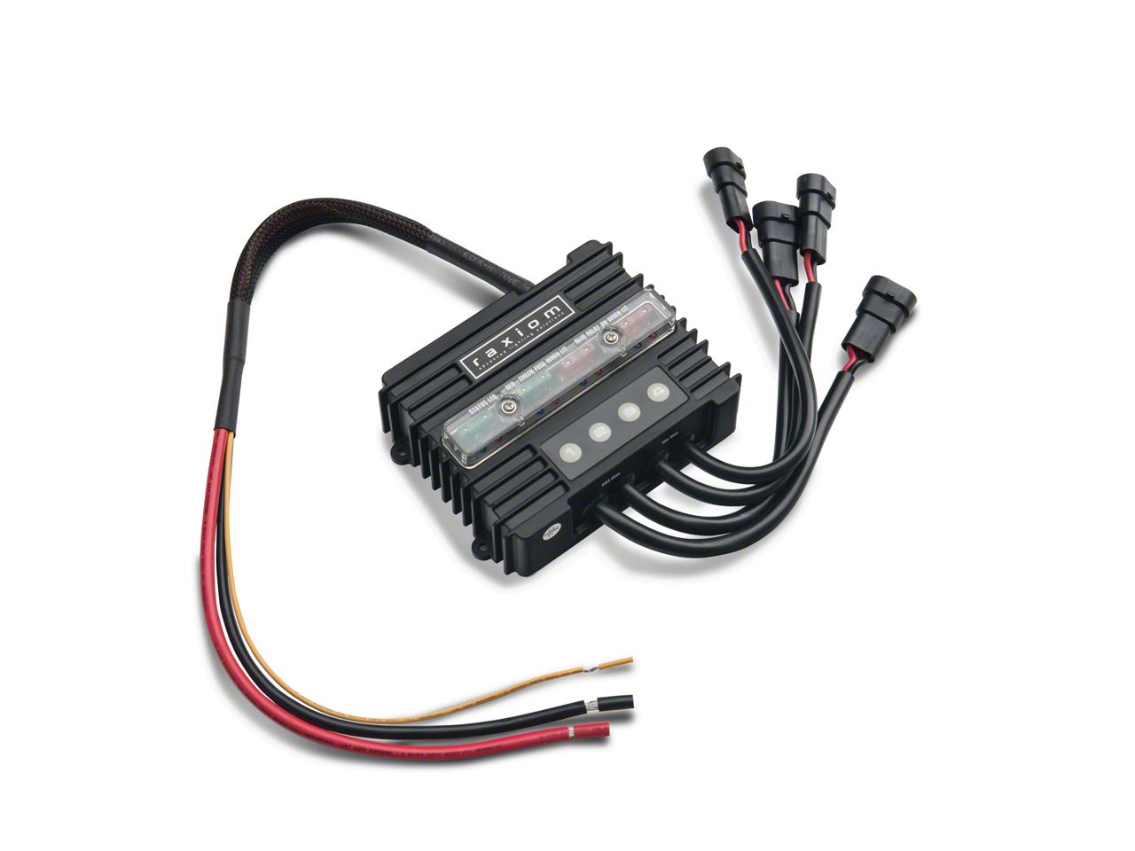 How it Works. You secure the control box of the Raxiom Wireless Accessory Controller near the battery. The module accepts 12-24 volt input, has (2) 10-amp-fused circuits and (2) 30-amp-fused circuits with 12-24 volt output and includes 4 wiring harnesses [(2) 12-gauge and (2) 14-gauge] with waterproof connectors. Simply plug your electronic accessories into the control box, then manipulate them wirelessly. You can use several remotes and control boxes together to manage up to 24 accessories. Additional remotes and boxes sold separately.