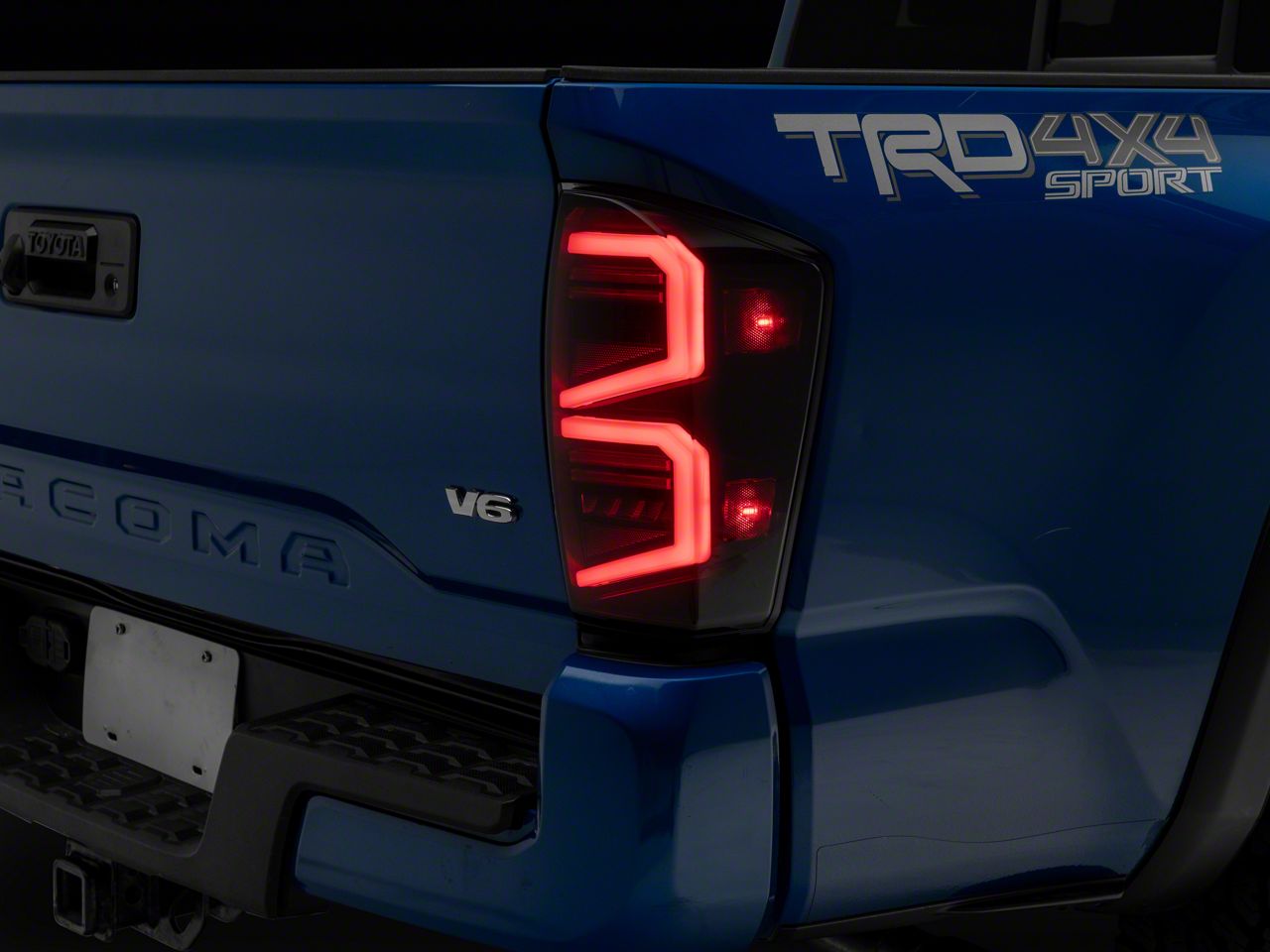 Application. These Raxiom ST LED Tail Lights; Black Housing; Smoked Lens are designed to fit 2016-2023 Toyota Tacoma models. Driver and passenger side included.