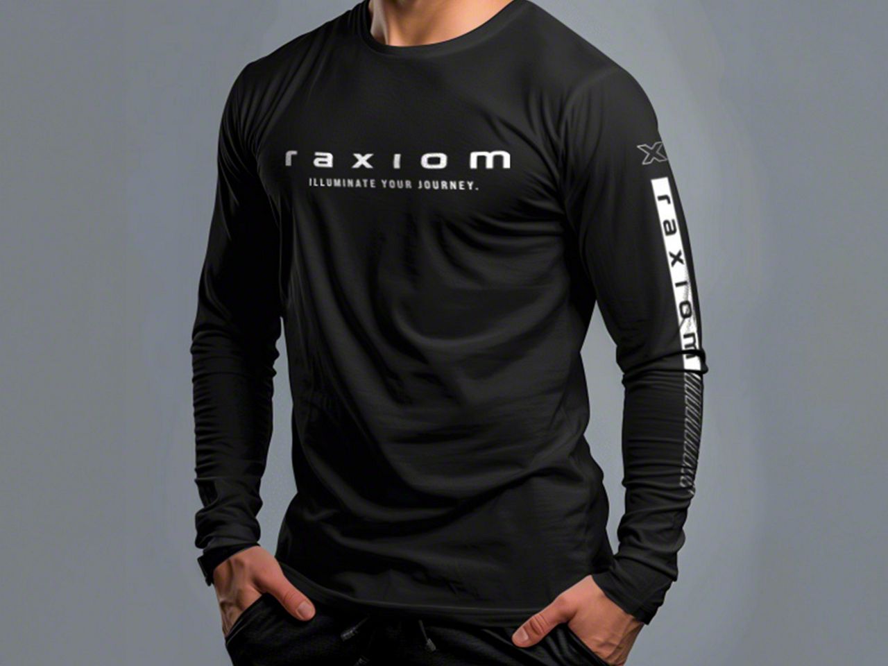 Raxiom Style. This Raxiom Illuminate Long Sleeve T-Shirt is a classy way to show your appreciation for the Raxiom brand. With "raxiom" on the center and down the left sleeve, it says, "ILLUMINATE YOUR JOURNEY" across the chest. It is definitely a statement on this lighting brand.