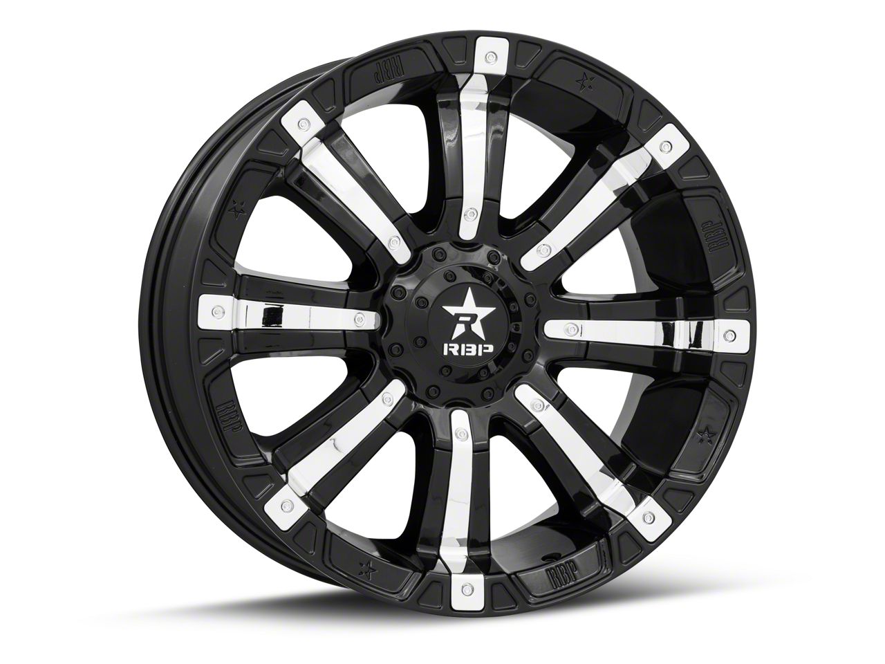 RBP 94R Black with Chrome Inserts 6-Lug Wheel; 20x10; 10mm Offset. The RBP 94R Black with Chrome Inserts 6-Lug Wheel offers a striking balance of style and refinement. Its unique design accentuates the vehicle's aesthetic, while the premium construction underscores its robust nature. This wheel is a perfect choice for those seeking both elegance and a strong visual statement.