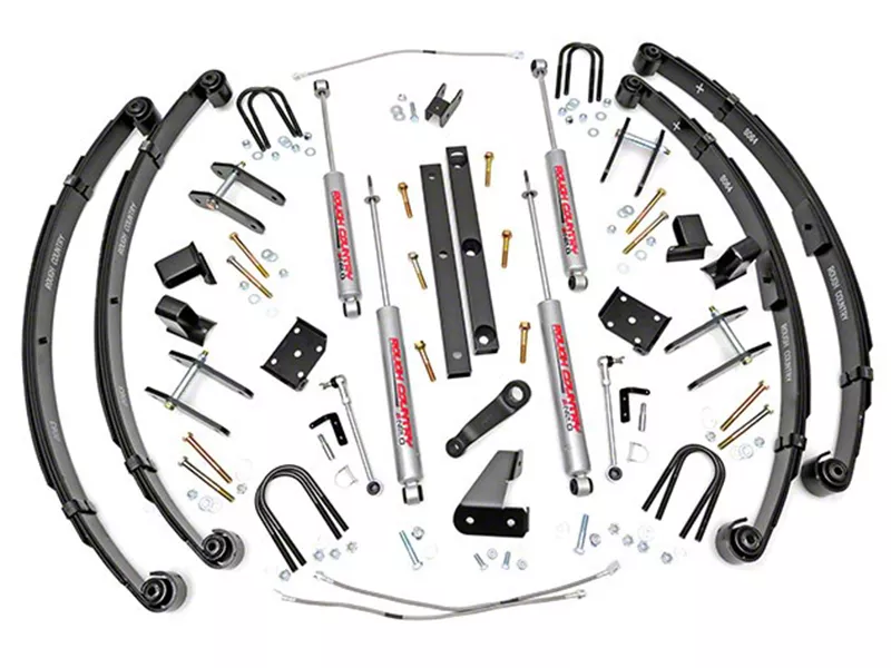 Kit Contents. This 4.5 inch Wrangler lift kit contains Military Wrapped leaf springs, front and rear premium N2.0 Series shocks, Boomerang lift shackles, a transfer case drop kit, a steering pitman arm, front quick disconnects, a front track bar bracket, a rear track bar bracket, front and rear stainless steel brake lines, front and rear bump stops, U-bolts and hardware.