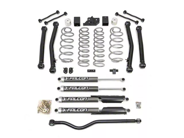 Impressive Off-Road Performance. This ReadyLIFT 4.50-Inch Front and 4-Inch Rear Terrain Flex 4-Arm Lift Kit with Falcon 2.1 Shocks transform your Jeep into an even more capable off-road driving machine. It reinforces your suspension system with high-performance shocks, linear-rate springs, an adjustable track bar, and industrial-grade control arms. With this lift kit, you can enjoy better off-road control and dominate the competition with ease.