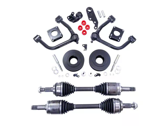 Construction and Appearance. This kit features CNC-machined billet aluminum spacers and heavy-duty steel components engineered for strength and longevity. The included high-performance CV axles are built specifically for lifted applications, ensuring proper driveline geometry and enhanced durability in rugged environments.