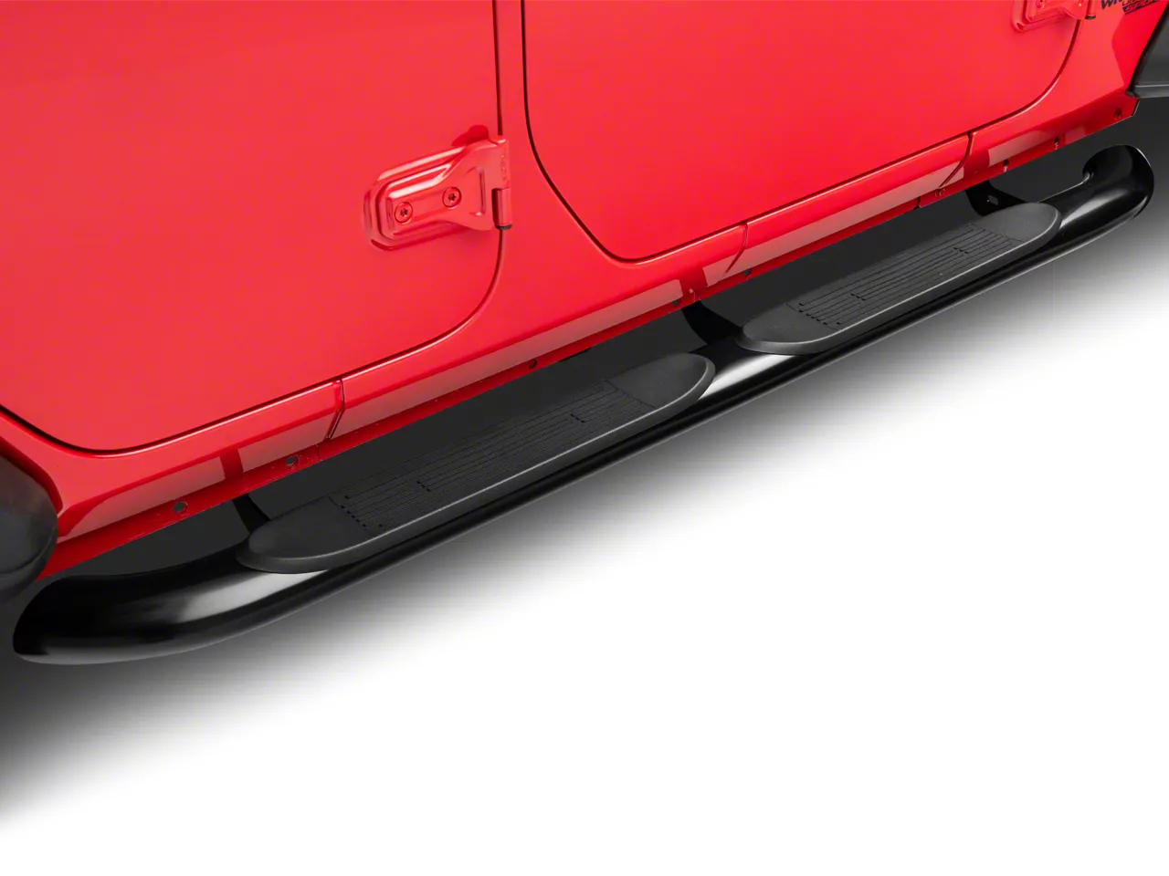 Application. These Gloss Black RedRock 4x4 4-inch Curved Oval Side Step Bars are designed to fit 2018-2026 4-door Jeep Wrangler JL models. Includes driver and passenger side.