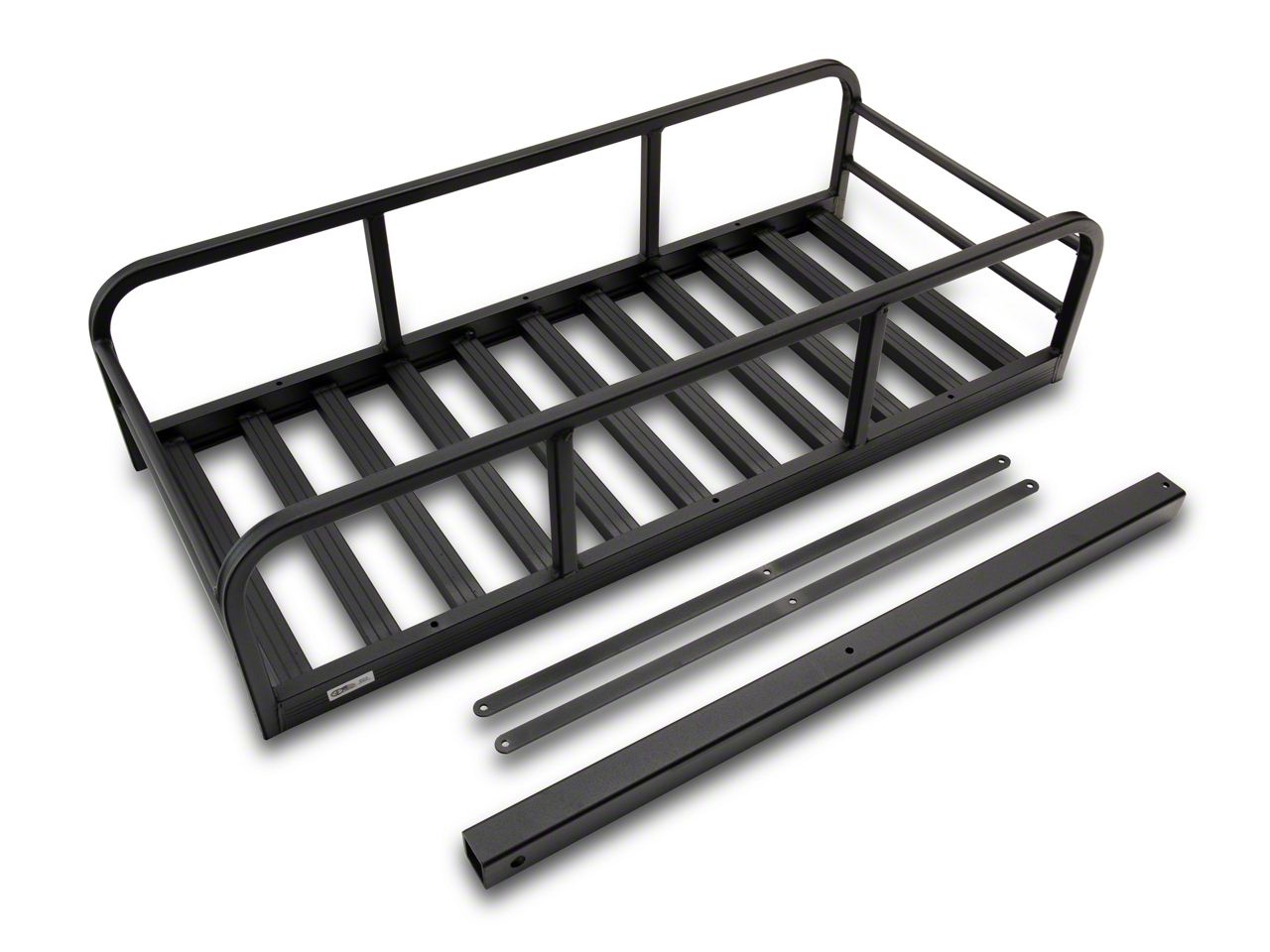 Extra Storage. For those with an active family lifestyle this Redrock 4x4 Hitch mounted Cargo Rack will increase the amount of storage space available for long trips and adventures. Providing you with 48" x 22" x 12" of extra space, this rack mounts directly to any standard 2 inch receiver to give you more cargo space for trips when your Toyota is at maximum capacity. It easily accommodates larger aftermarket tires and tire carrier bumpers by giving you enough room to open and access your tailgate while remaining installed.
