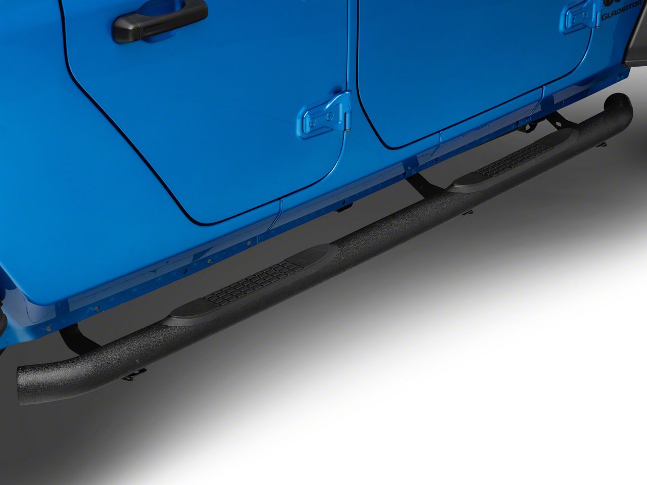 Application. These RedRock 4x4 3-Inch Round Side Step Bars; Textured Black are designed to fit 2020-2026 Jeep Gladiator JT models. Driver and passenger sided are included.