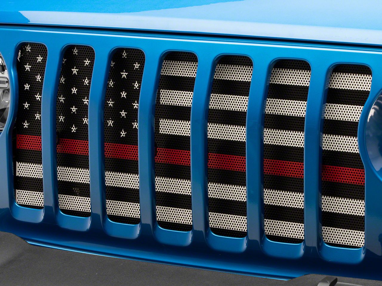 Patriotic Styling and Protection. RedRock's American Flag with Red Stripe Grille Insert is a great way to show your support for all of America's Fire Fighters. Ideal for daily drivers and off road enthusiasts, this JT Grille Insert will protect your Gladiator's radiator from all types of trail hazards and road debris, while the black and white US Flag design with red stripe will give your Jeep a more patriotic appearance.