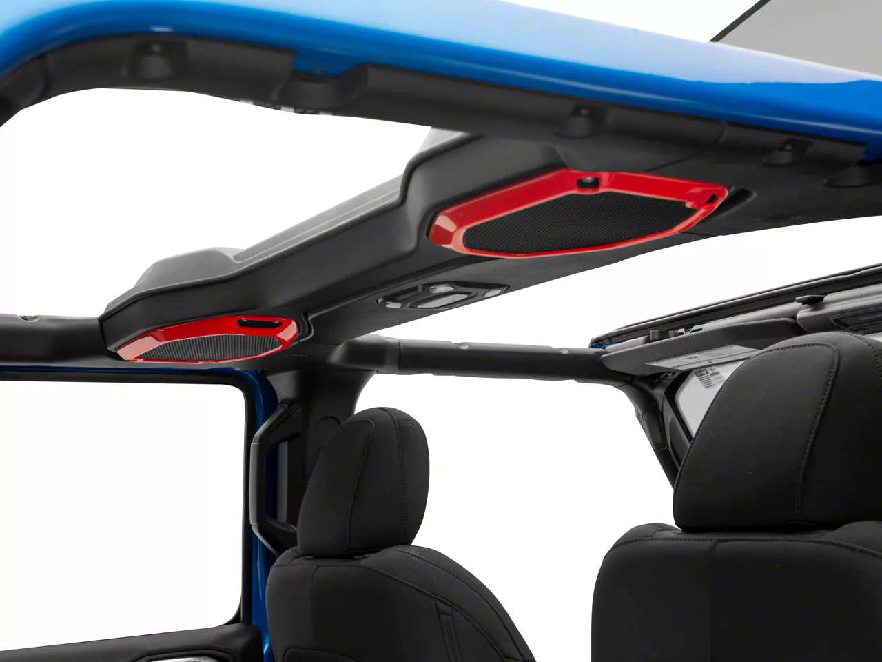 Application. These RedRock Pillar and Roof Speaker Trim Accent Bezels; Red is designed to fit 2020-2023 Jeep Gladiator JT models.