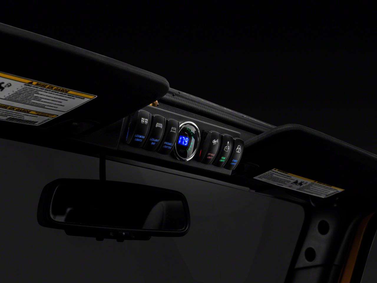 Twelve Volt Accessory Controller. Now you can easily control auxiliary lights and/or 12V accessories by installing a RedRock 4x4 6-Switch Control Box on your 2007-2018 JK. Designed to mount above your rear view mirror, the Switch Panel contains 6 heavy duty, lighted rocker switches and a center mounted digital LED voltmeter that allows you to keep a close eye on your battery's power.