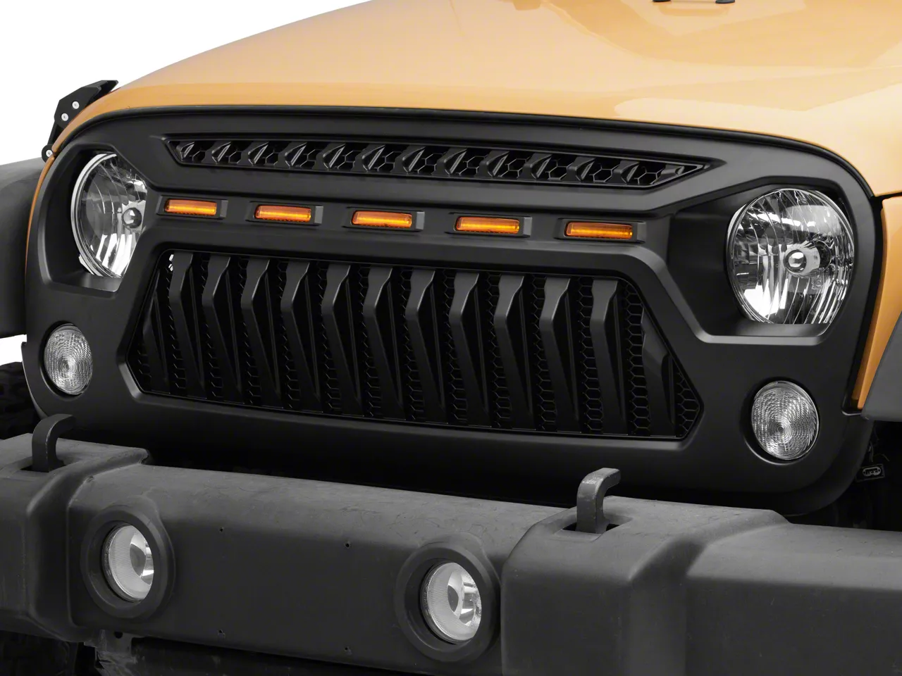 LED Accent Lighting. This Gladiator Style Grille also includes five high mount amber LED accent lights. These LED accent lights come with a wiring harness that simply splices into your Wrangler's existing factory headlight harness. The LEDs will then automatically activate in conjunction with your running lights. The eye-catching LEDs not only look great, but will also make your Wrangler more visible to other drivers at night and in poor weather conditions.