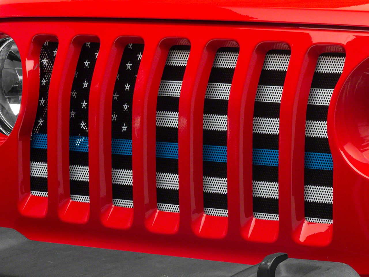 Patriotic Styling and Protection. A RedRock American Flag Grille Insert is a great way to show your support for the good ole US of A, while adding extra protection to your JL Wrangler. Ideal for daily drivers and off road enthusiasts, this JL Grille Insert will protect your Wrangler's radiator from all types of trail hazards and road debris. Also notable is the blue line that serves as one of the flag's stripes to show support for the men and women of the United States law enforcement agency's.