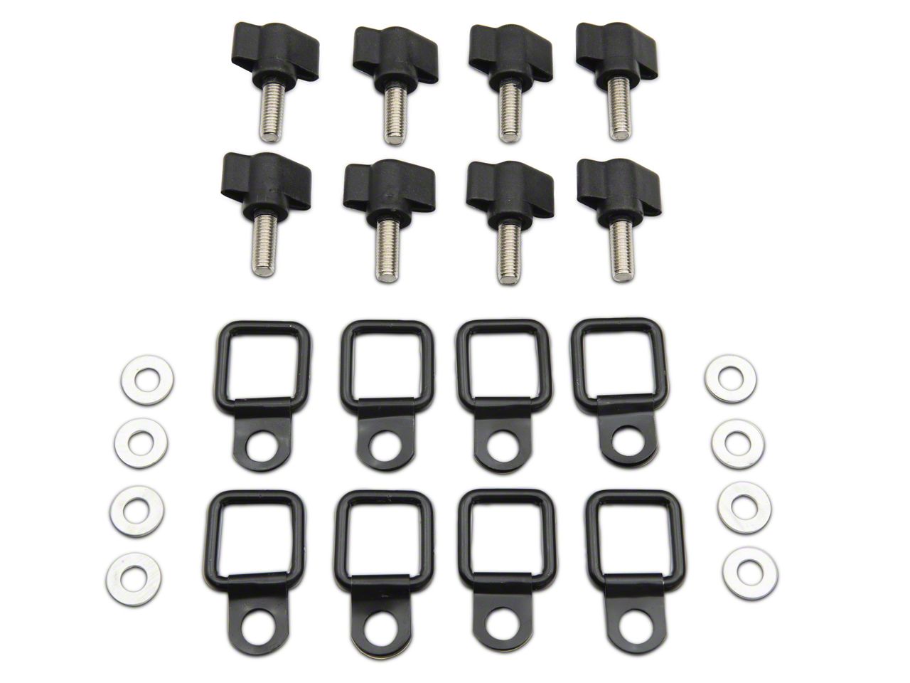 Quick Removal Fasteners. Stop searching for the correct size tools when installing or removing your Wrangler's Hard Top with a RedRock 4x4 Hard Top Quick Removal Fastener Kit. This Kit replaces your factory hardware with thumb screws making installation and removal super easy. Kit Includes (8) Thumb Screws, (8) Washers and (8) D-Rings.