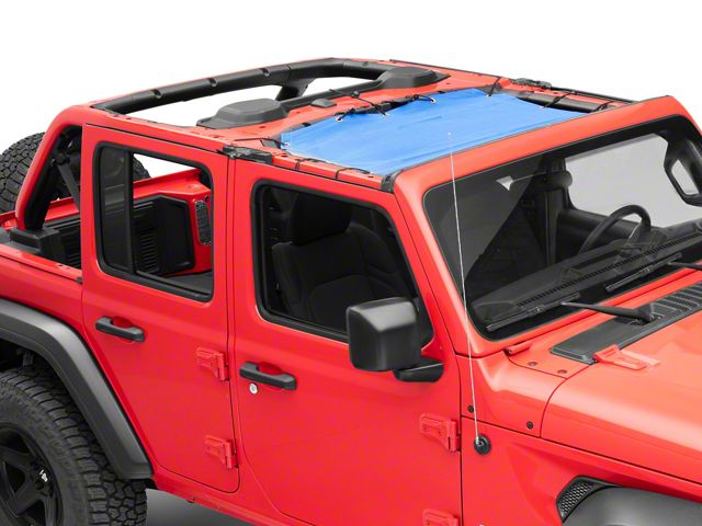 Application. This RedRock 4x4 Mesh Sun Shade; Front; Blue is designed to fit 2018-2023 Jeep Wrangler JL models.