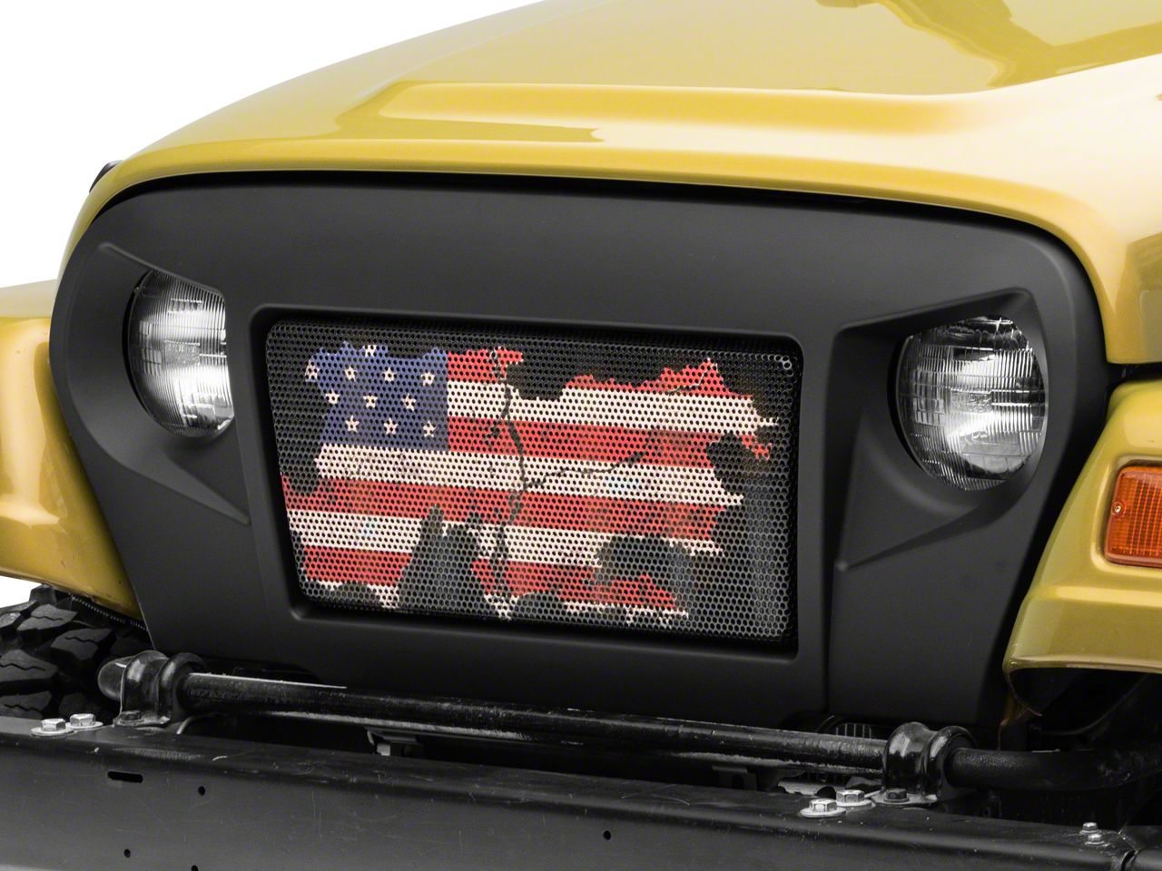 Spartan Styling. A RedRock 4x4 Spartan Grille will add powerful patriotic styling to the front end of your 1997-2006 Jeep Wrangler. With a full color distressed Flag insert, this Grille features a furrowed brow for an aggressive appearance. Designed to be installed in place of the factory grille, this RedRock 4x4 Grille will transform the appearance of your Wrangler from a mild mannered daily driver into a mean off-road machine.