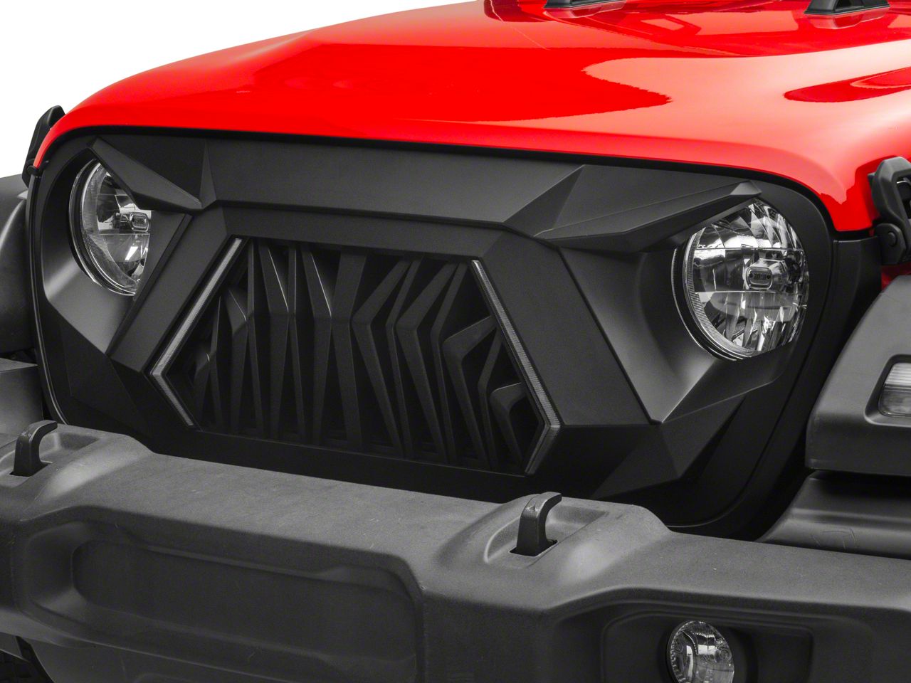 Goliath Styling. RedRock's V2 Goliath Grille will add aggressive styling to the front end of your 2018-2026 JL Wrangler. Featuring an angry eye design with unique angular vertical bars, this Grille includes two integrated LED daytime running lights for a striking appearance. Designed to be installed in place of the factory grille, this RedRock Grille will transform the appearance of your Wrangler from a mild mannered daily driver into a mean off-road machine.