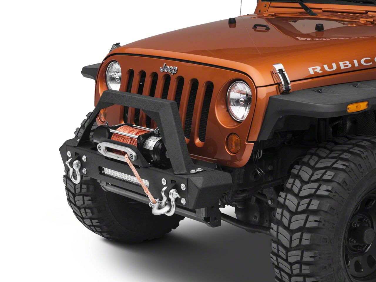 Stubby Max-HD. Ideal for rugged off-road use the RedRock 4x4 Max-HD Stubby Width Front Bumper was designed to be much shorter than your 2007-2018 JK's stock bumper, so it won't obstruct your front wheels when trying to negotiate over and around trail hazards. Featuring a fabricated over-rider bar, this Max-HD Stubby Bumper includes two high strength D-Ring mounts with 9,500 pound rated D-Rings. The built-in winch plate is capable of supporting a 12,000 pound winch. Additionally this Max-HD Front Bumper includes an auxiliary LED light bar for complete confidence in any night time adventure.