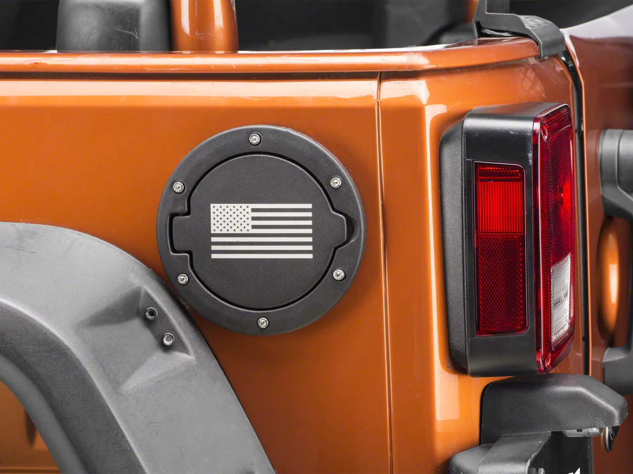 Design. This Fuel Door Cover is finished in a textured black coating with the American flag pictured in the center in black and white. It looks remarkable and adds style dimensions to your Jeep you hadn't seen before.