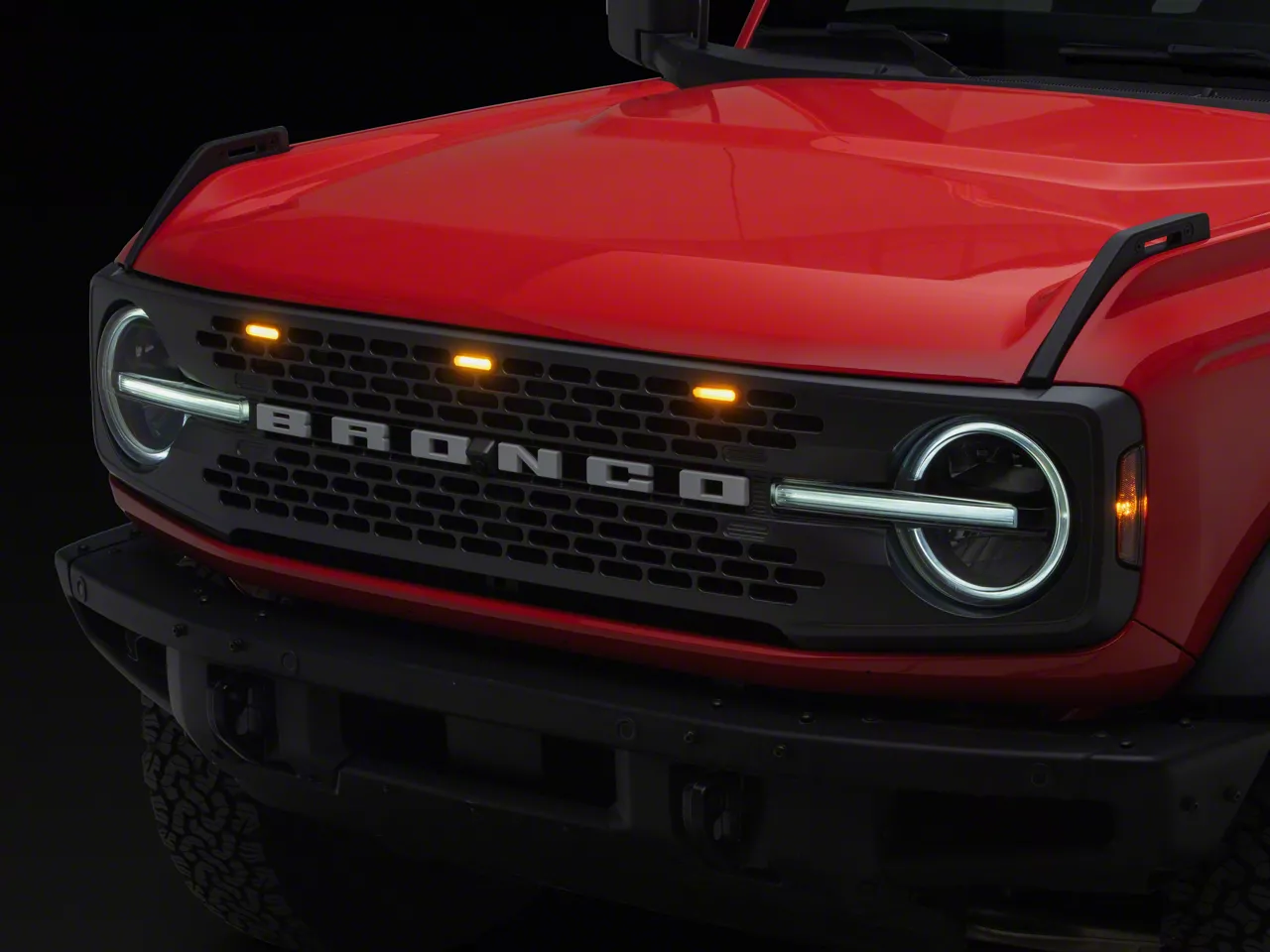 Grille Accent Lighting. Upgrade the look and improve the safety of your Ford Bronco with a RedRock 3-Piece LED Grille Light Kit. When installed these eye-catching LEDs will automatically activate in conjunction with your running lights. These Grille Lights not only look great, but will also make your Bronco more visible to other drivers at night or in poor weather conditions.